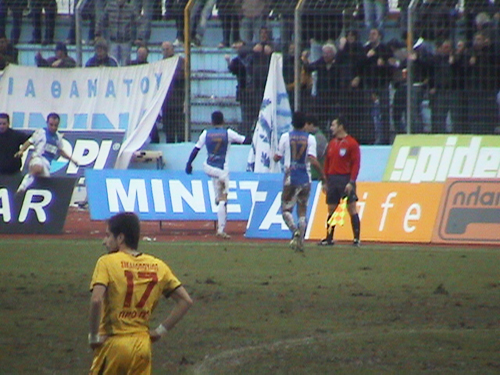 Το έργο του στέφηκε με επιτυχία, αφού η ομάδα μας δεν κατάφερε να πετύχει άλλο γκολ κατά τη διάρκεια του πρώτου ημιχρόνου. Οι παίκτες μας έδειξαν αρκετά μπλοκαρισμένοι μετά την αποβολή του Μέζα, αλλά παρόλα αυτά έχασαν ευκαιρίες για την επίτευξη ενός ακόμη τέρματος. Στην λήξη του ημιχρόνου, το διαιτητικό τρίο αποδοκιμάστηκε έντονα από τους περίπου 6000 φιλάθλους του ΠΑΣ που είχαν κατακλύσει το γήπεδο, ενώ ο ο Ηλίας Σολάκης δέχτηκε κίτρινη κάρτα, γιατί τόλμησε και πήγε να μιλήσει στον άρχοντα του αγώνα. Στα αποδυτήρια προκλητικότατοι για μια ακόμη φορά οι παίκτες της Καστοριάς, τόνισαν ότι χρωστάνε χάρη στον κ. Κούγια από πέρσι και φυσικά προσπάθησαν έτσι να δικαιιολογήσουν τα καραγκιοζιλίκια που έκαναν στο πρώτο ημίχρονο. Αποφεύχθηκαν τα χειρότερα με την παρέμβαση των ψυχραιμοτέρων, αλλά μάλλον ο ρέφερυ πήρε το μήνυμα, καθώς στο δεύτερο ημίχρονο άλλαξε κάπως την αγωνιστική του συμπεριφορά. Το γήπεδο πάντως πήρε φωτιά και κατά την είσοδο του ρέφερυ στο αγωνιστικό χώρο για το δεύτερο ημίχρονο, που φυσικά τον αποδοκίμαζε εν χορώ για τον τρόπο διαιτησίας που είχε επιλέξει.