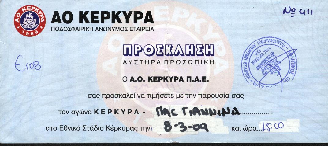 Αυτή είναι μια πρόσκληση που επίτηδες κρατήσαμε και φαίνεται καθαρά ο αύξοντας αριθμός Νο 411, φυσικά μόνο από την ΠΑΕ Κέρκυρα. Άραγε πόσες τόσες είχε ρίξει στην κυκλοφορία ο κ. Καλογιάννης;